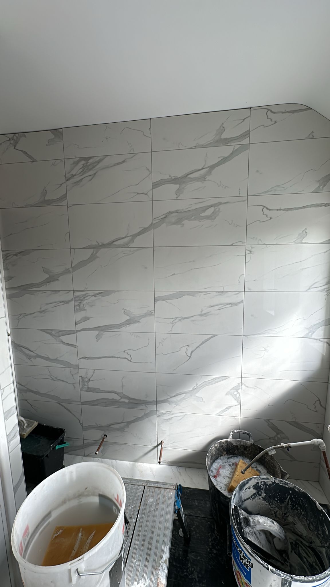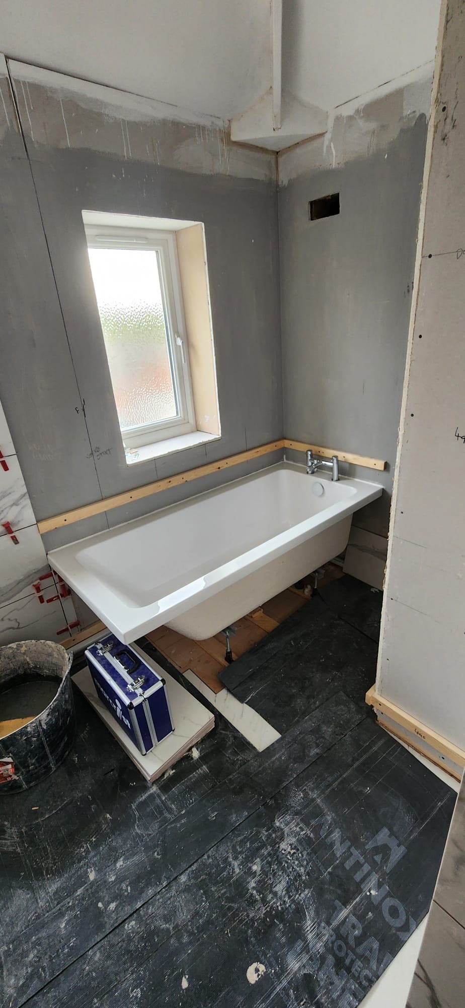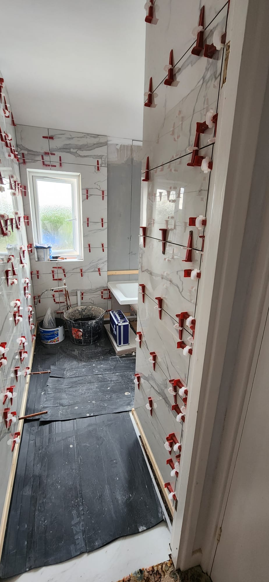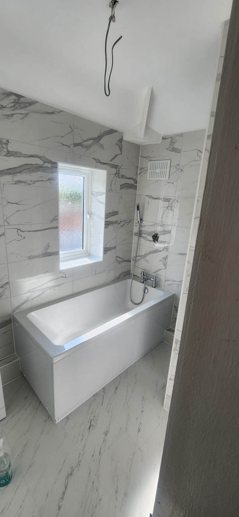 • Structural preparation: Stripping the room back revealed uneven brickwork and old services. We reboarded and levelled walls to ensure a flawless tiling surface.