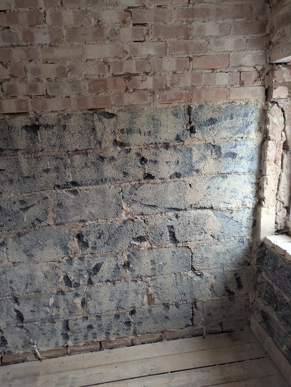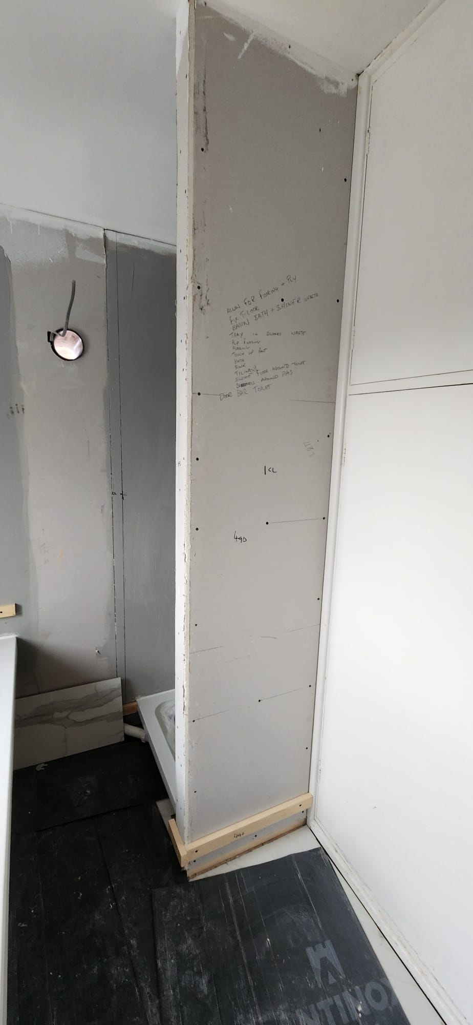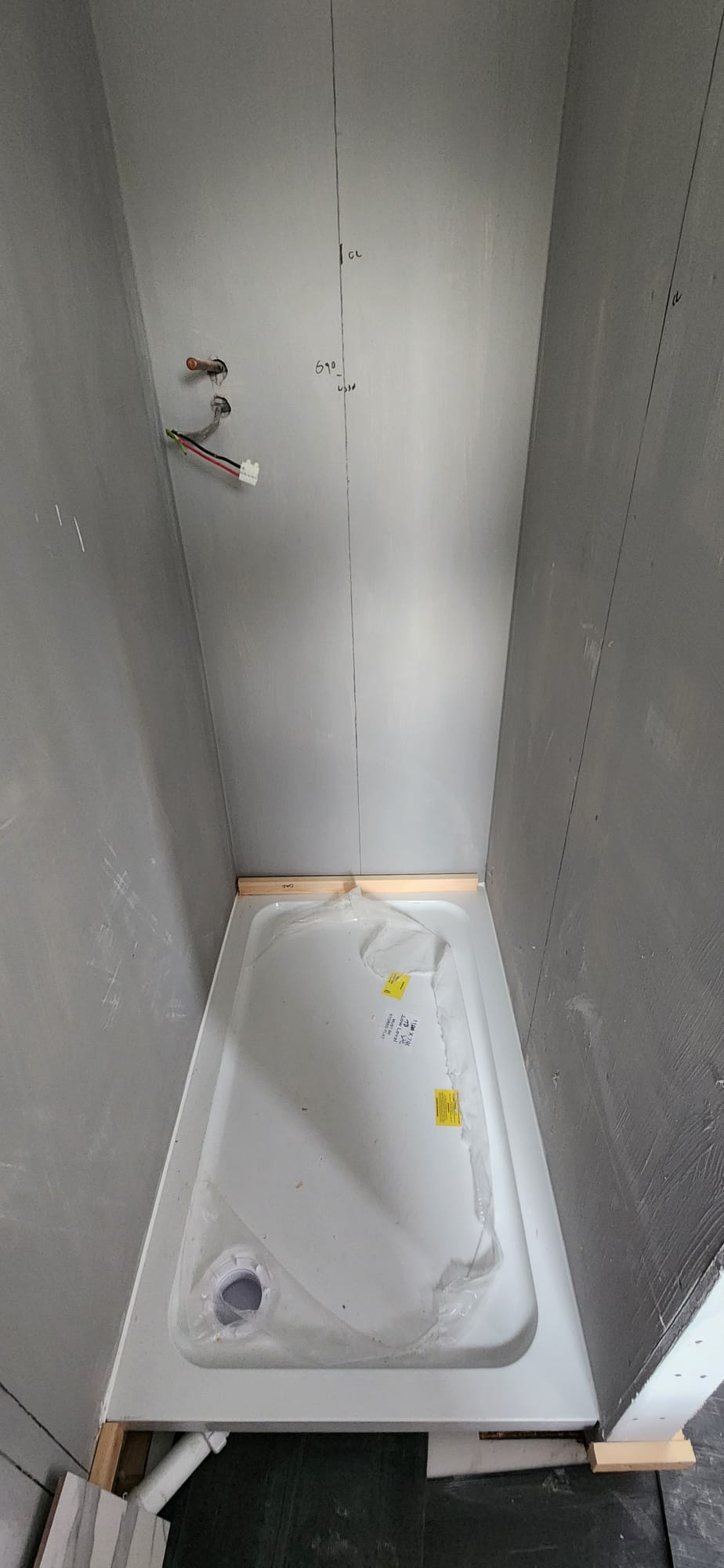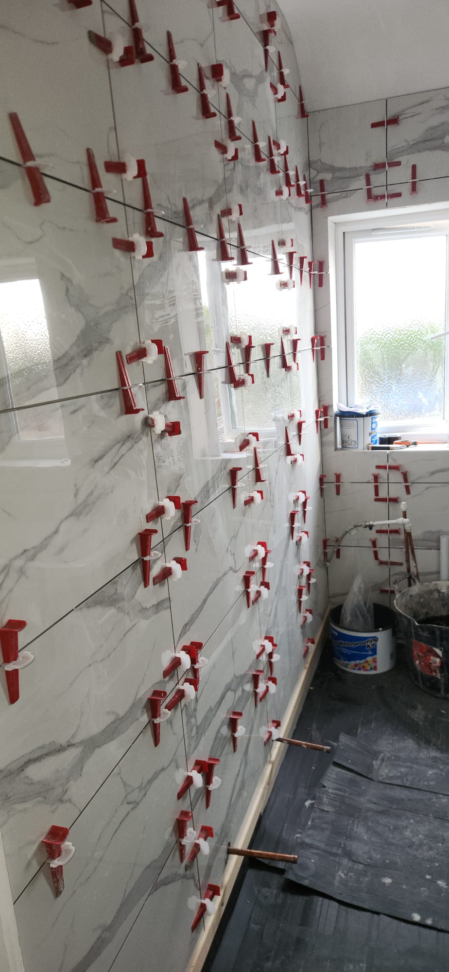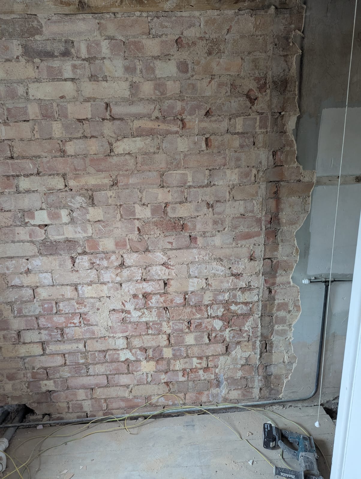 • Structural preparation: Stripping the room back revealed uneven brickwork and old services. We reboarded and levelled walls to ensure a flawless tiling surface.