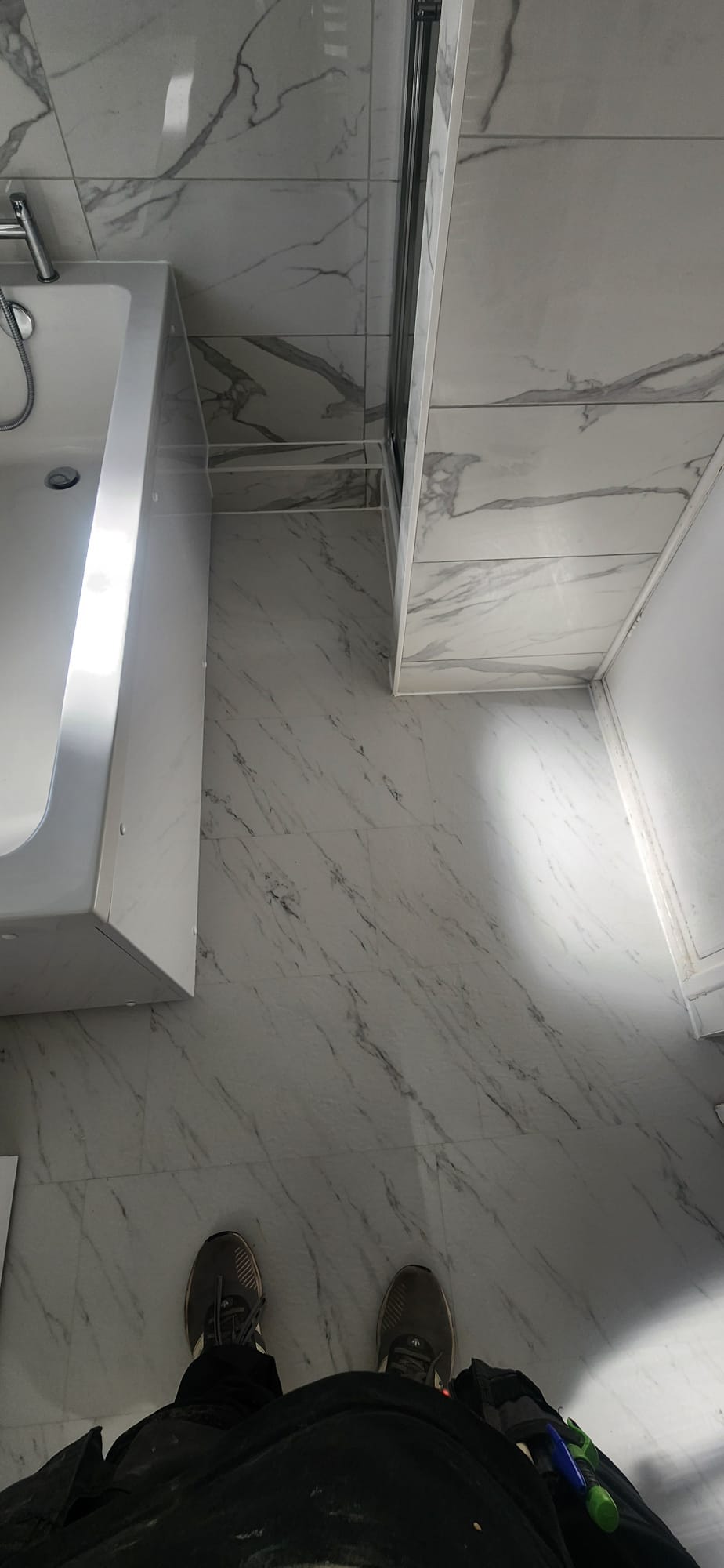 • Shower enclosure: Built-in tray and enclosure, lined with the same marble-effect tiles for a seamless look.