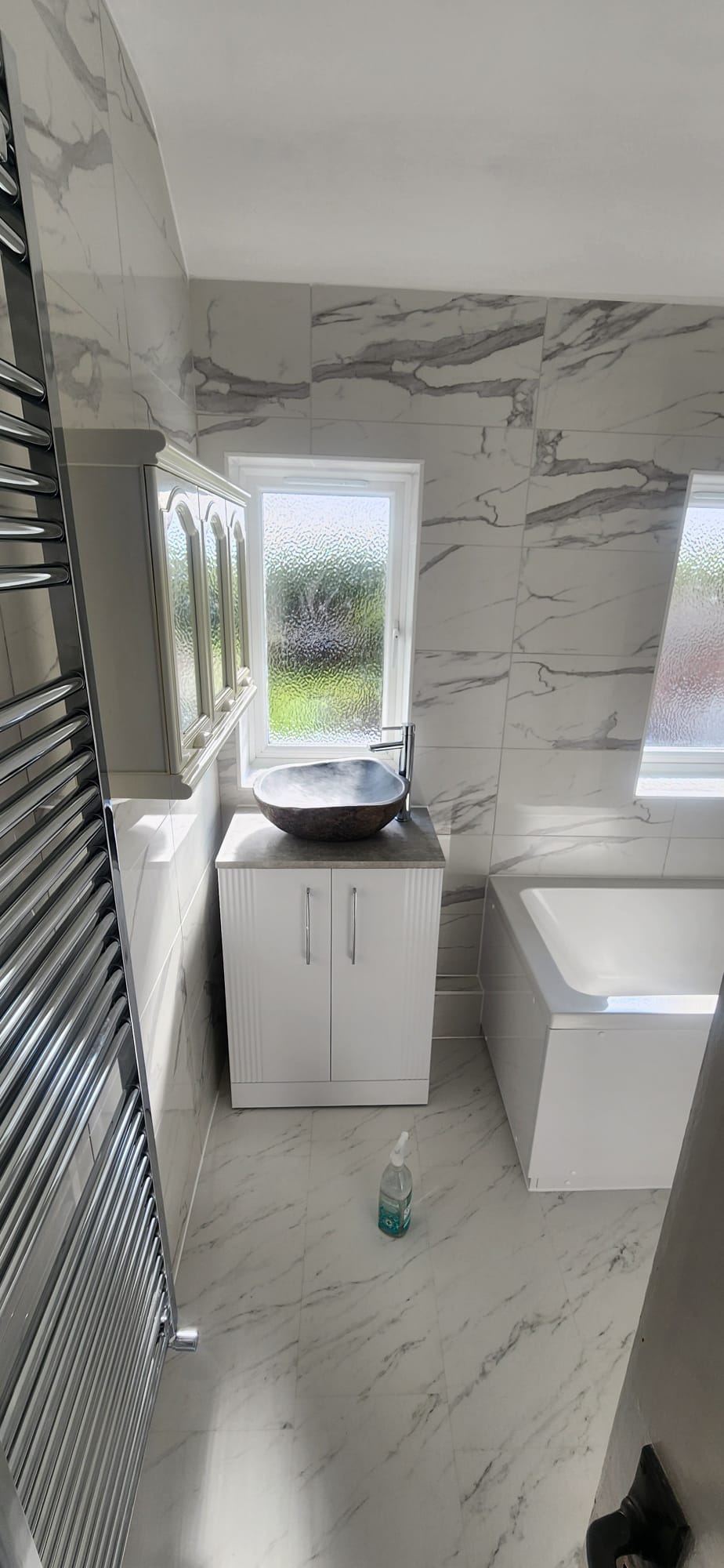 The finished bathroom is unrecognisable from its starting point. Light bounces around the room thanks to the reflective marble tiling, while the mix of bath and shower makes the space versatile for family life. The client was particularly pleased with the luxury hotel-style finish and the thoughtful use of space.