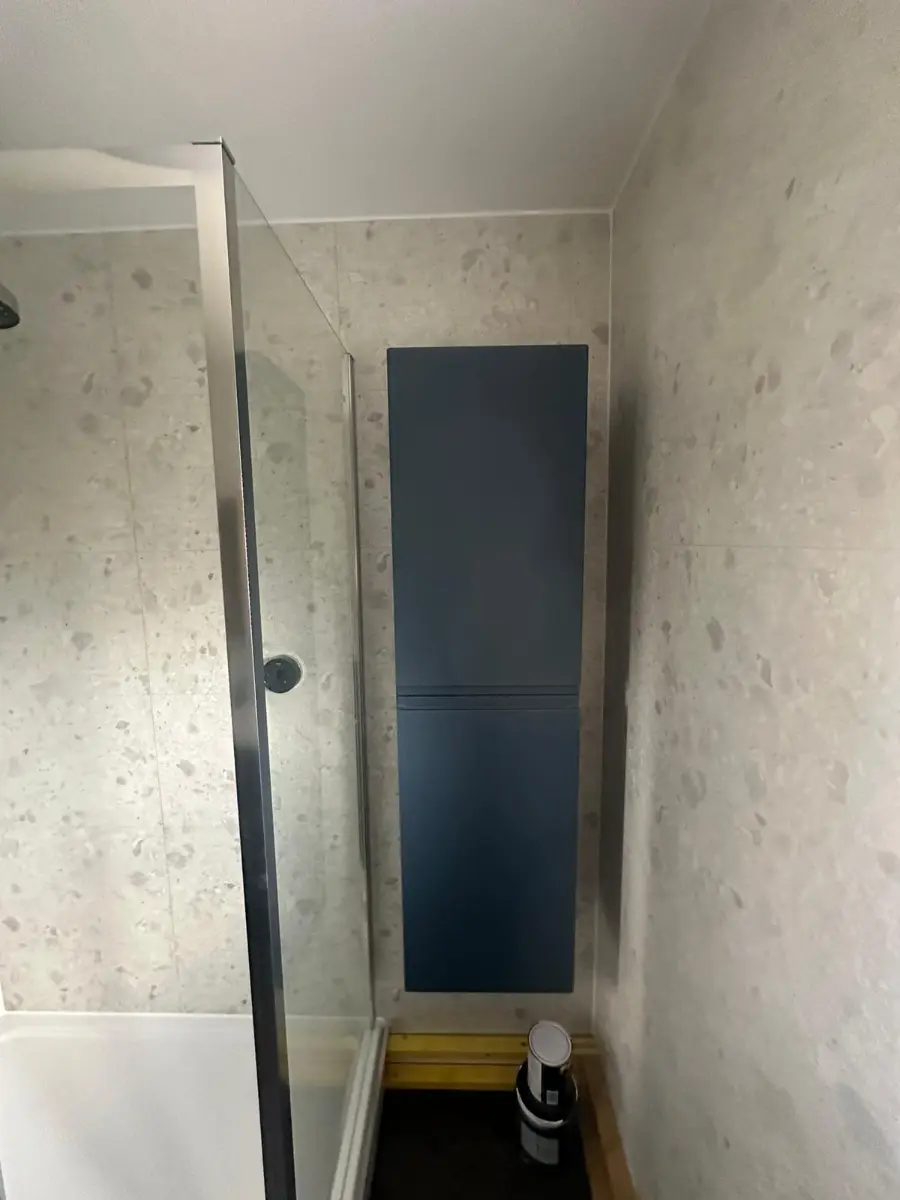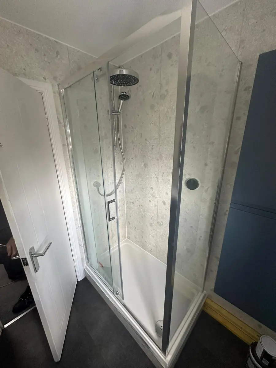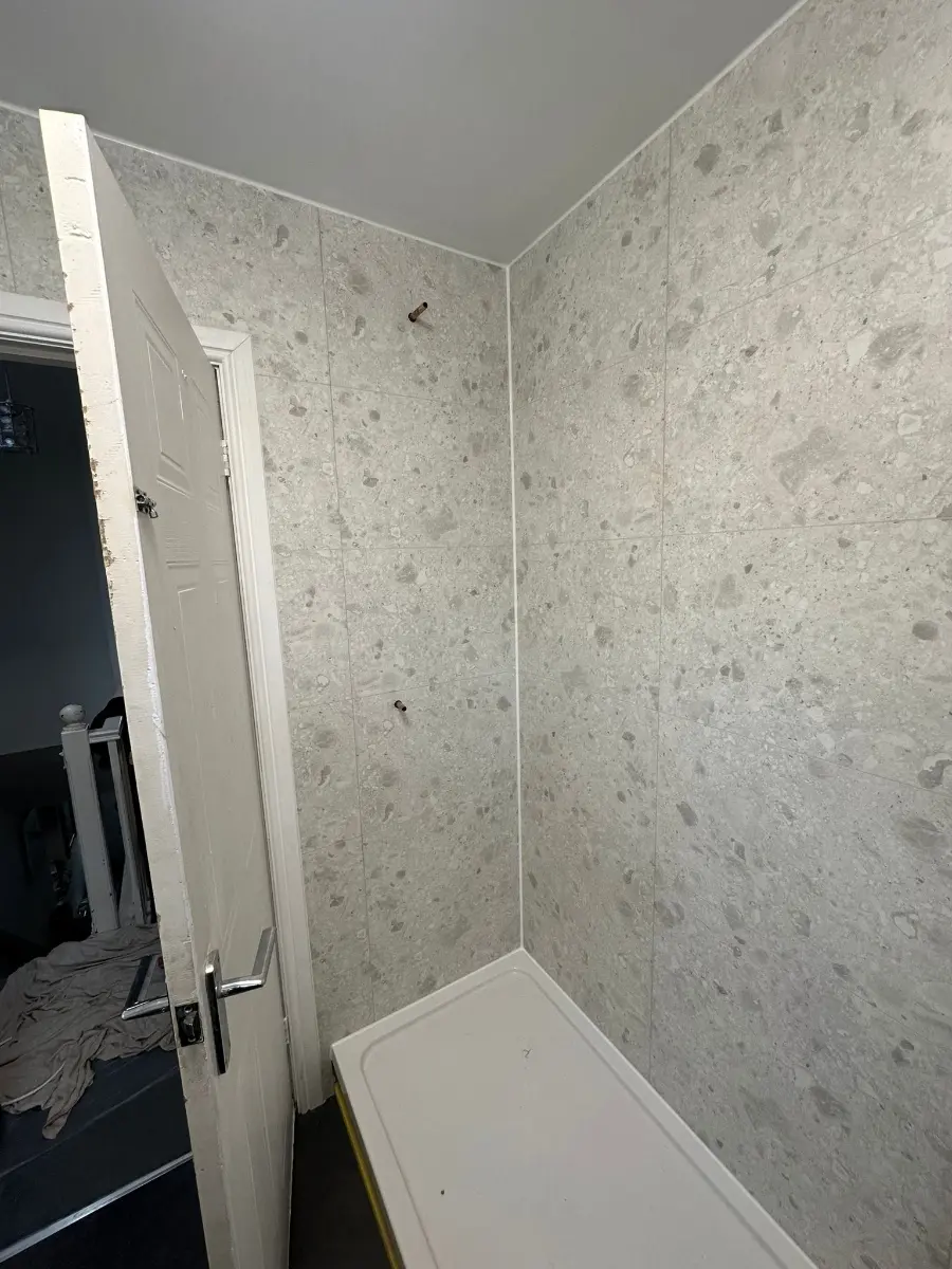 Final Touches We finished the room with high quality tile effect panels. Every seal is watertight and the whole job meets current building regulations.