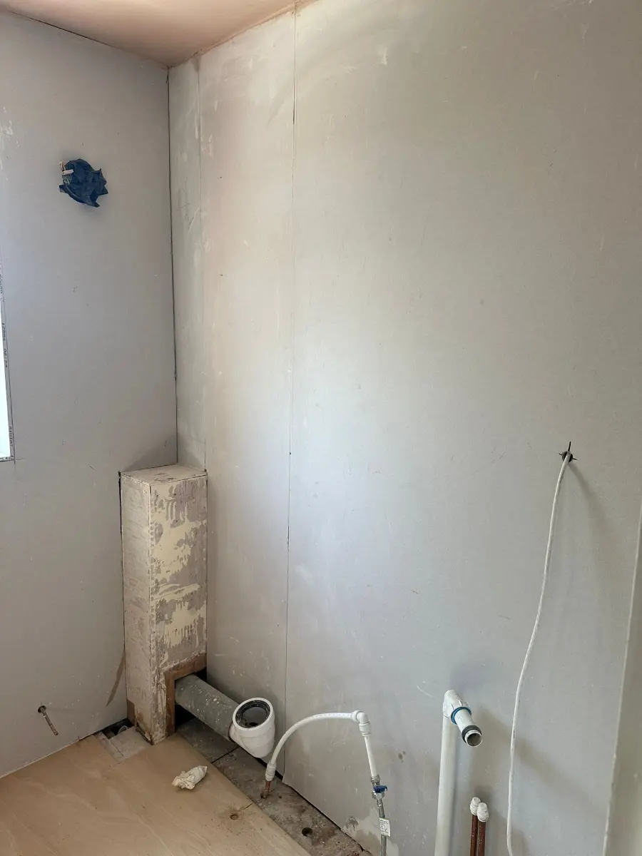 First Fix Work Before we could close the walls we ran new water pipes to where the shower, sink and radiator would go. We connected the waste pipes and soil stack for proper drainage. The central heating pipework went in at this stage too.