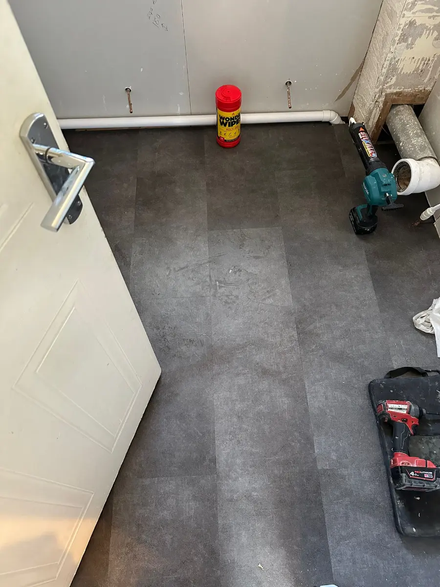 Toilet and Basin We fitted a modern toilet with new waste and water connections. The basin has a mixer tap and all the pipework is hidden where possible. Everything is sealed to prevent leaks.