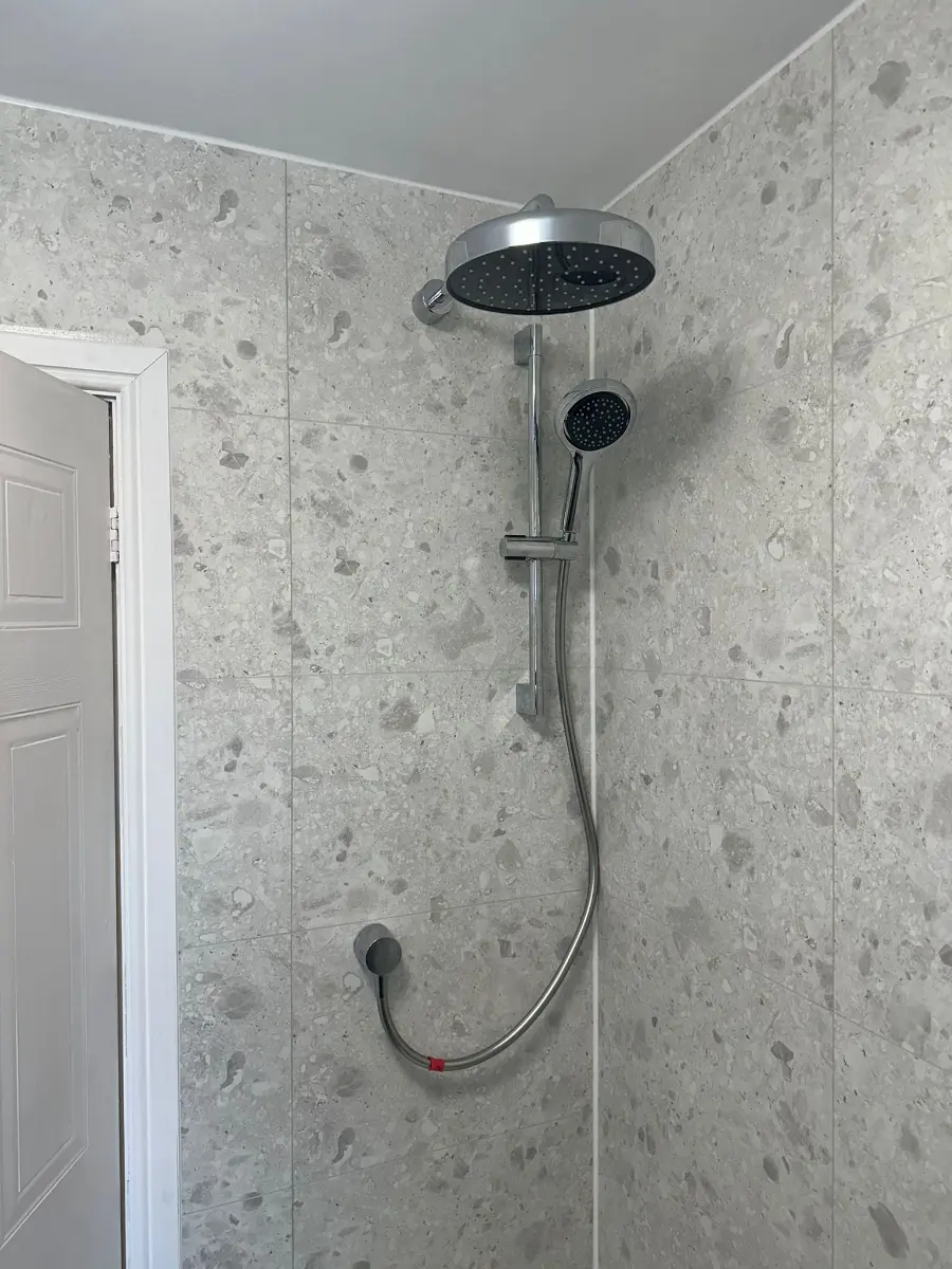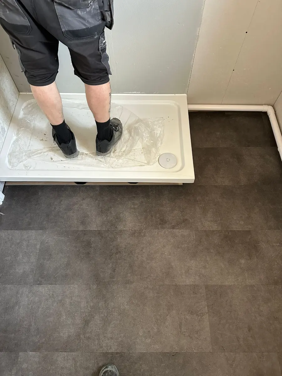 Shower The new shower tray sits at the right angle for proper drainage. We connected it to the existing drainage and sealed everything with waterproof adhesive and silicone. The mixer valve and controls went in with concealed pipework for a clean look.