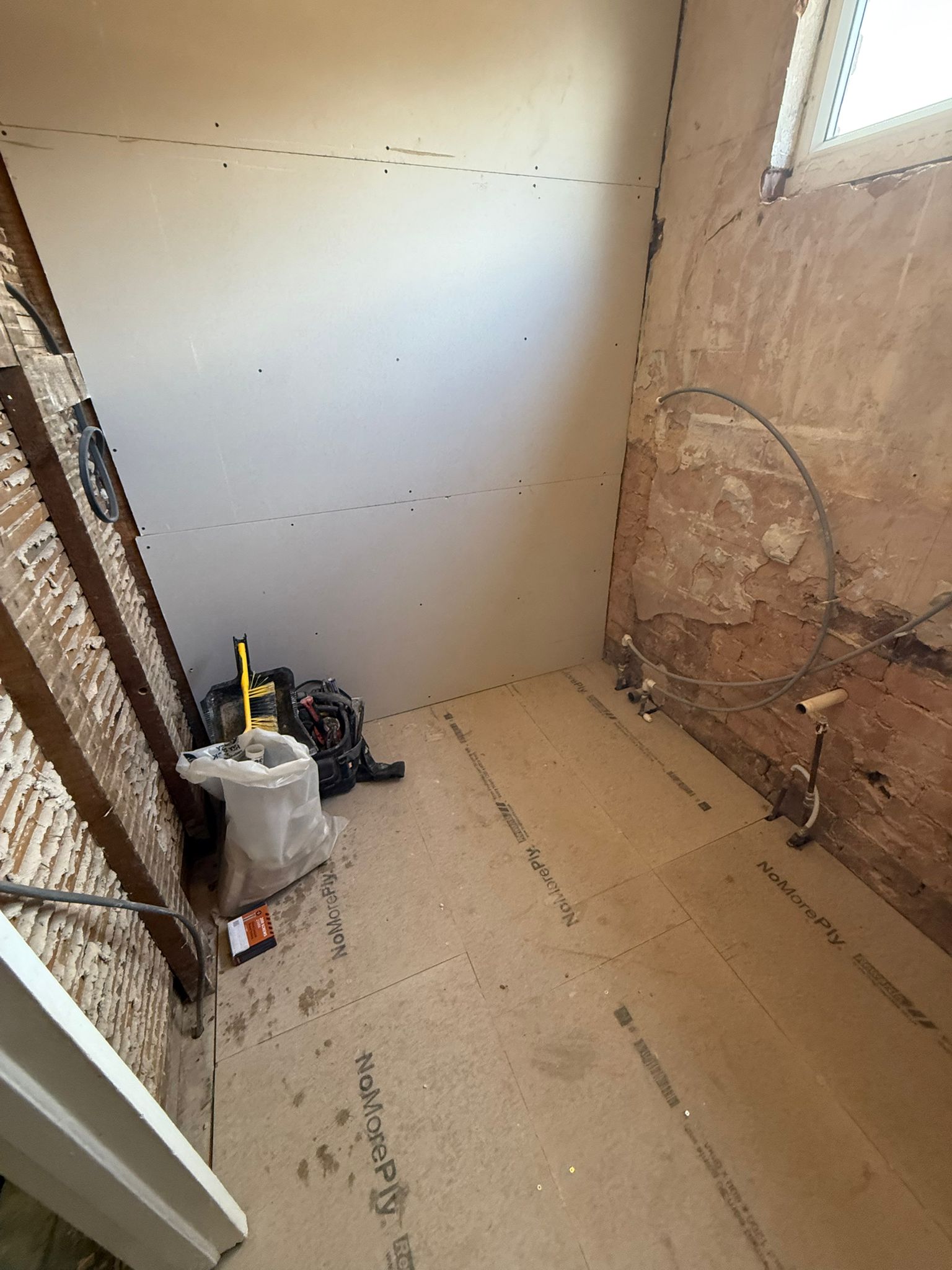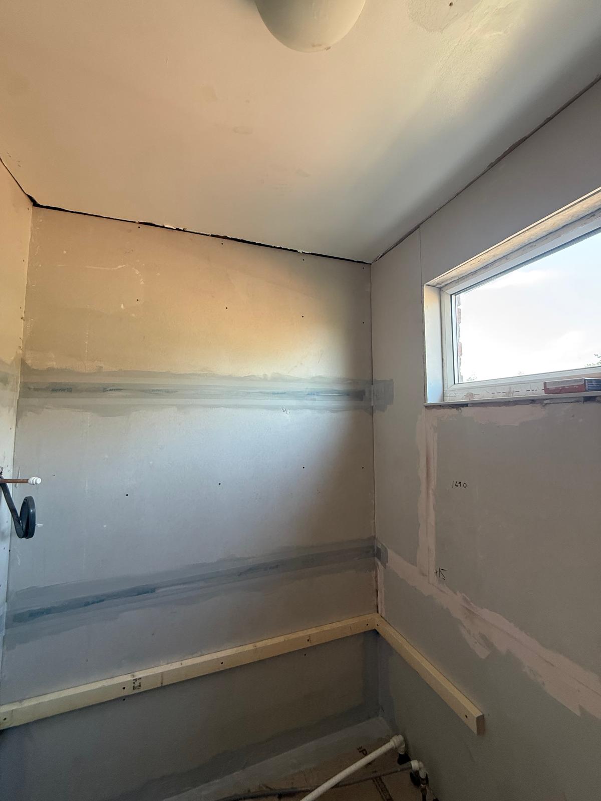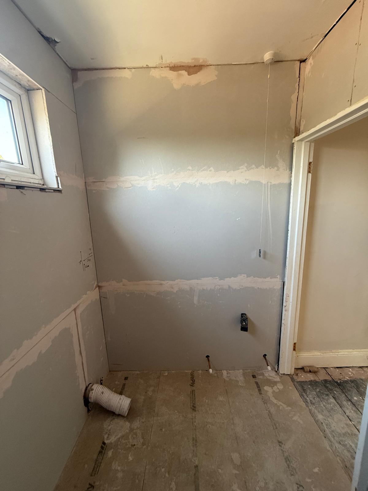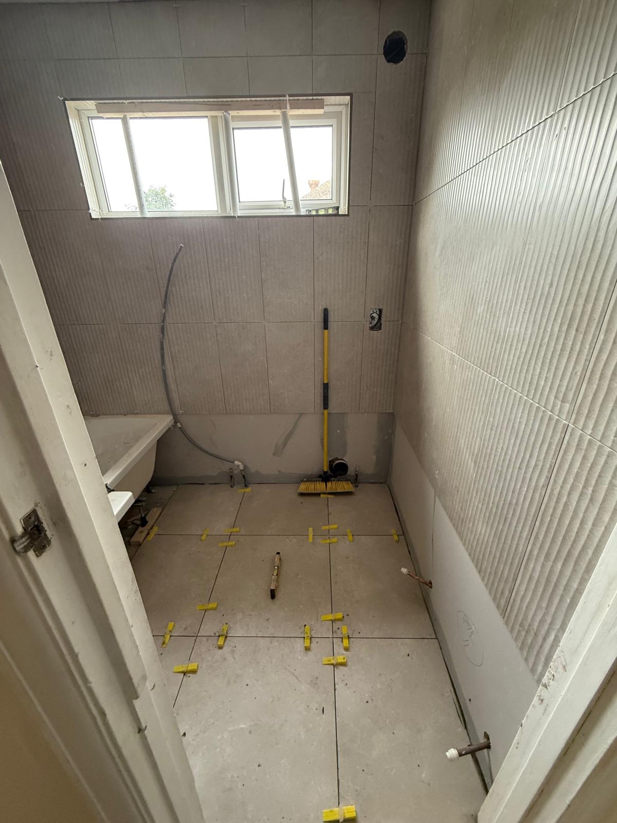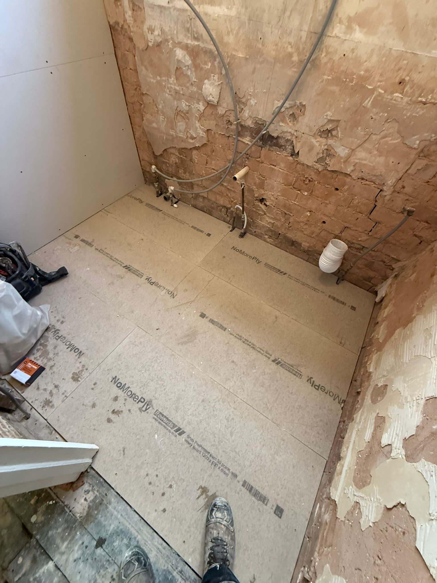 • Uneven walls and floors: We stripped the room back, reboarded, and levelled surfaces to provide a strong foundation for tiling.